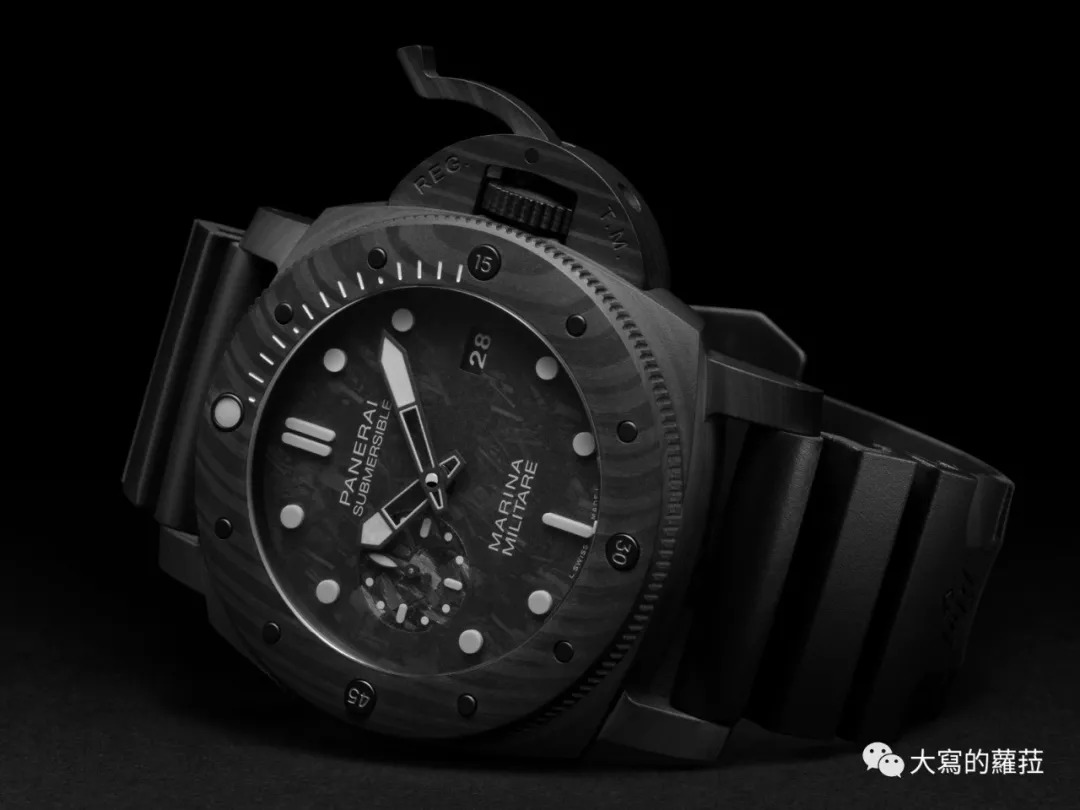 △ 沛纳海SUBMERSIBLE MARINA MILITARE CARBOTECH 潜行系列碳纤维腕表(PAM979),Carbotech碳纤维复合物表壳与表圈,钛金属表背,直径47毫米,P. 9010自动上链机芯,儲能72小时,防水300米,定价约151,000人民币