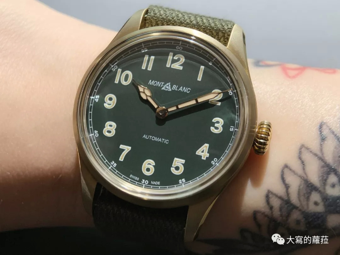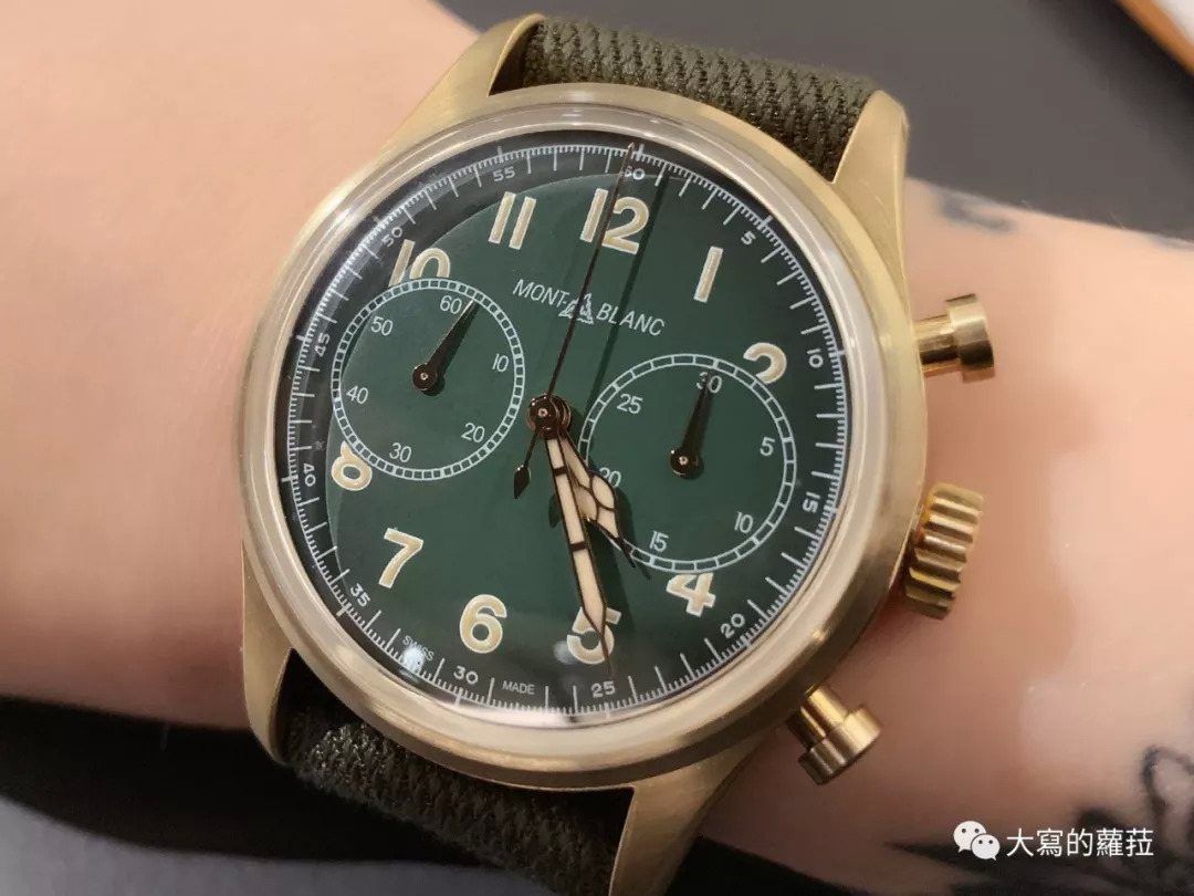 沛纳海在品牌初期早已开始尝试各种特殊材质的表壳打造,少见的钽金属表壳PAM192是市场上再也难寻得的款式,更不要说沛纳海以一只PAM382青铜材质打造的潜水表,掀起了钟表圈青铜材质的风潮,特别是青铜搭配绿色面盘的款式。2019年的日内瓦表展上不约而同的可以看到不少青铜壳绿面表款:万宝龙1858系列的青铜绿面三针、计时码表两个款式,以此系列特有的复古风格,并特地使用万宝龙的旧式品牌字样搭配上突起的镜面,整体浓浓的复古军表的质感。