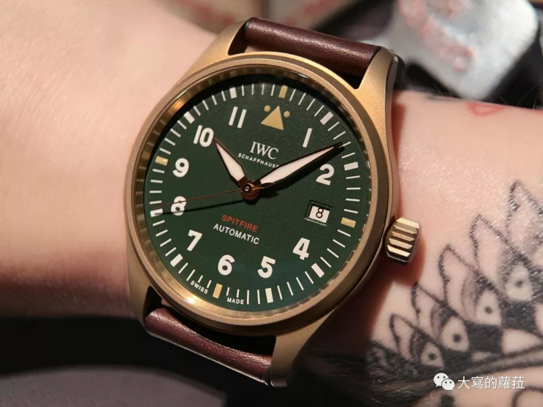 说到军表风格不能略过IWC万国表的飞行员系列,2019年IWC的飞行员系列将Spitfire款式再扩充,以青铜材质打造出三款也是绿色面盘的设计,不过IWC的青铜材质与其他品牌所使用的青铜略有不同,根据IWC产品总监Walter E. Volpers说明:一般的青铜材质经过一定时间的使用,就会产生绿色的表面氧化,因为IWC并不满意这种不可避免的绿色氧化效果,因此IWC使用的青铜材质加入了特殊的合金,在使用过程中,氧化的效果是呈现偏黑色的喑哑,更贴近IWC在美感上的坚持。