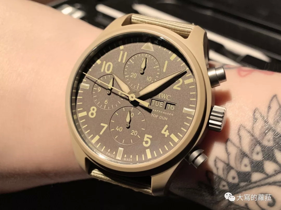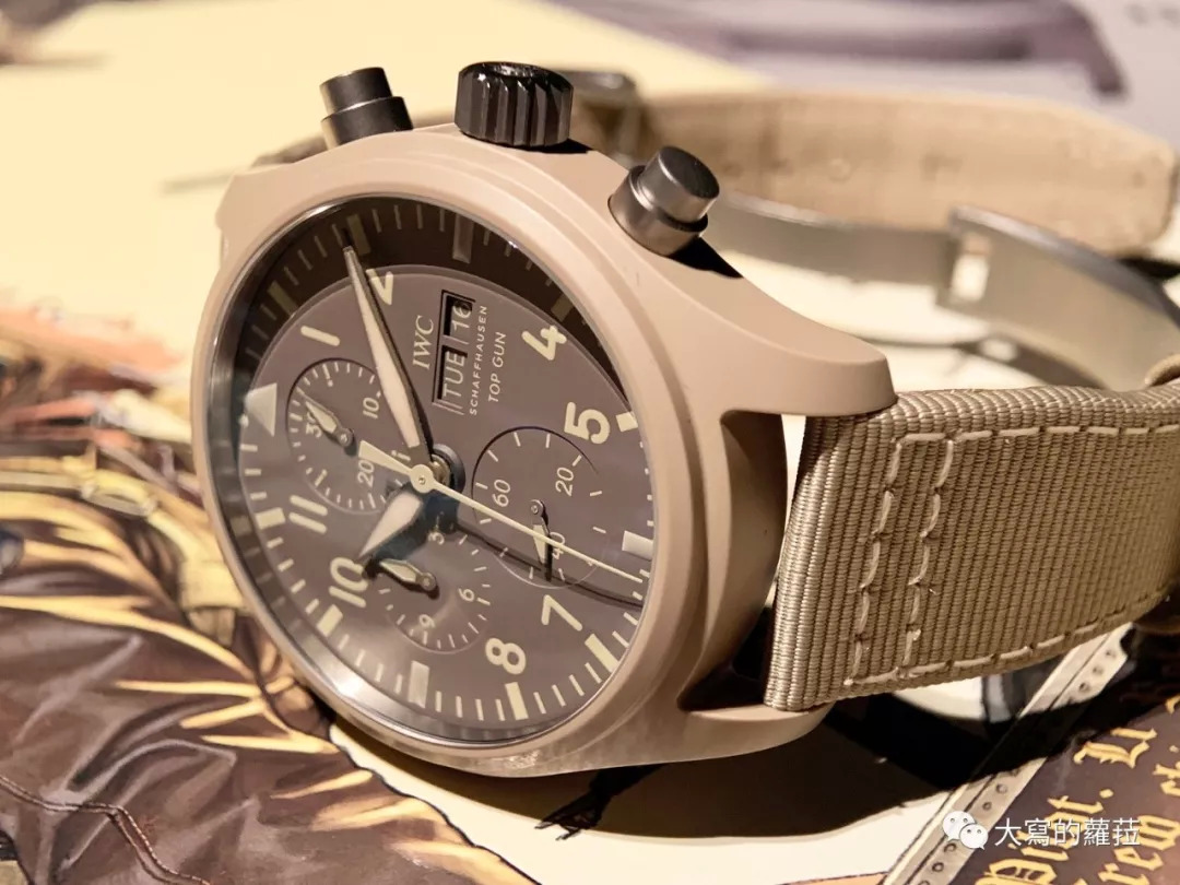 △ IWC万国表飞行员系列TOP GUN海军空战部队计时码表(IW389103),沙色陶瓷表壳,直径44.5毫米,钛金属表背,69380自动上链机芯,储能约46小时,防水约60米,限量500只。