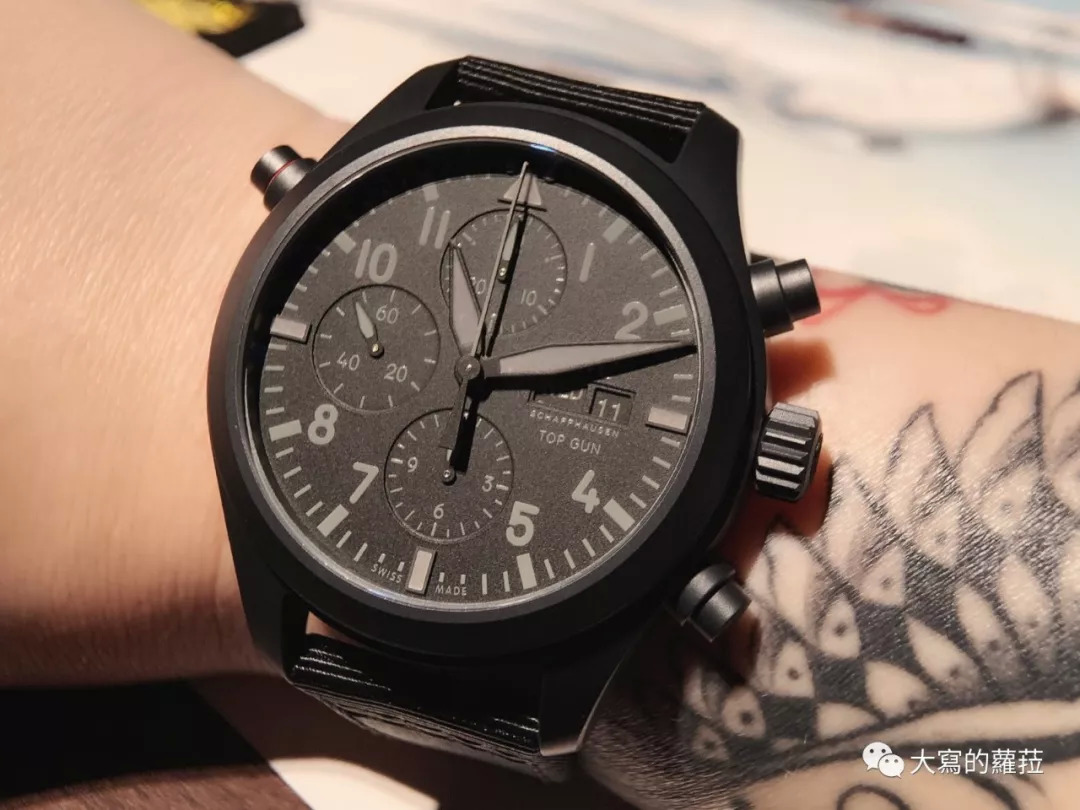 陶瓷材质铸模烧制后,只需要经过简单的打磨就可以成形,所以其制作难度在于原料配方与烧制成形的精准拿捏,如果要如金属材质一样进行手工的细部打磨,并达到高级制表的严格标准,就有难度。于是IWC在2019年的日内瓦表展就推出了瓷化钛金属材质Ceratanium ,这种瓷化过程势将钛合金锻炼的过程将氧气散入,让钛金属的表面瓷化,但并不影响成品的高抗刮痕、轻质、抗敏、耐腐蚀等特性,但经过这种瓷化,Ceratanium 可以呈现一种特殊的哑黑颜色效果,并且可以如金属材质一样制作各种小部件,并可以手工做精细的打磨工艺。这也是为什么过去黑色陶瓷的IWC飞行腕表的表壳是陶瓷,但表冠与按钮皆为金属,而2019年的TOP GUN 海军空战部队瓷化钛金属双秒追针计时腕表,却可以整体从前到后都是黑色的瓷化钛金属制成。