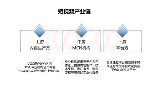 目前短视频行业已经形成完整的产业链,分工明确、各司其职,其中上游是内容生产方,包括UGC用户制作内容、PGC专业机构创作内容和PUGC专业用户上传内容。而中游是MCN机构,这是由于平台苦于对接众多个人创作者,于是出现了专业的机构组织优秀内容创作者,并提供内容制作、技术支持、推广宣发、流量变现等在内的专业化服务。下游是平台方,也是直接面向用户的环节,如独立平台有抖音、快手等,还有依附于其他资讯平台的如梨视频、秒拍等平台。