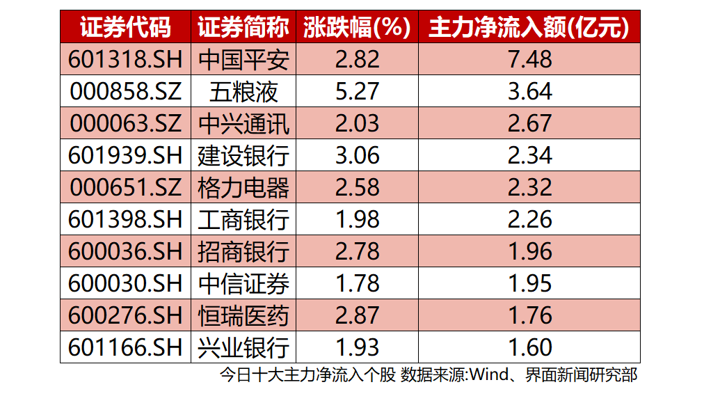 剔除尚未开板的新股,全天沪深两市主力净流入额超过1亿元的个股数量为18只。中国平安(601318.SH)、五粮液(000858.SZ)、中兴通讯(000063.SZ)成为最受主力追捧的三只个股,其净流入额分别为7.84亿元、3.64亿元、2.67亿元。银行股热度不减,建设银行(000001.SZ)、工商银行(601288.SH)、招商银行(600036.SH)、兴业银行(601166.SH)表现亮眼,分别吸收2.34亿元、2.26亿元、1.96亿元与1.93亿元主力净流入。