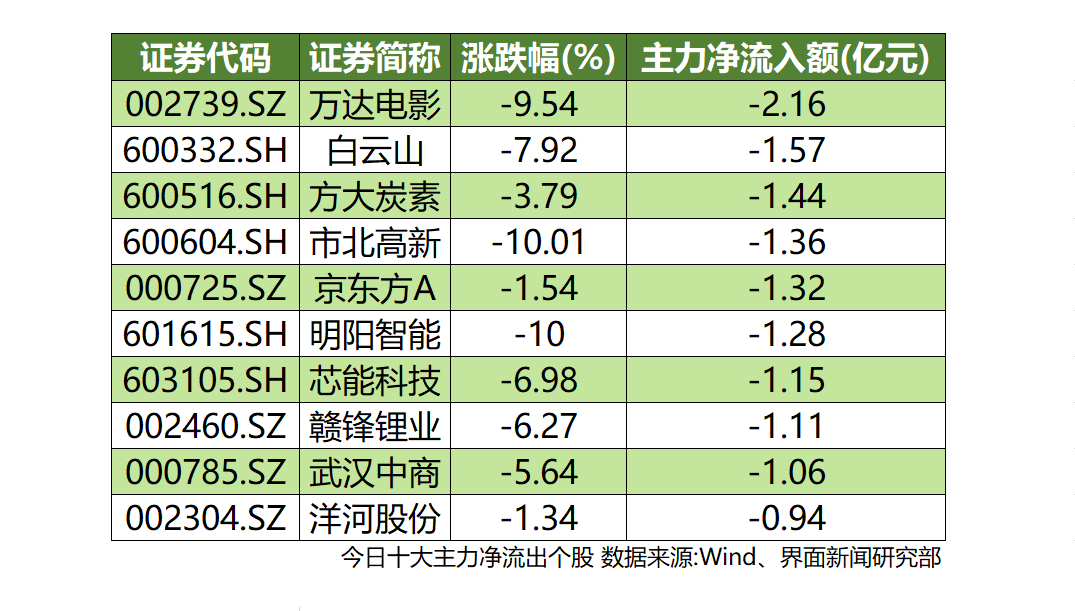沪深两市共计9只个股主力净流出额超1亿元。票房不及预期,30日发布业绩下修公告的万达电影(002739.SZ)今日遭主力大幅抛售,净流出额为2.16亿元。创投板块连续调整,妖股市北高新(600604.SH)跌停,遭到1.36亿元主力抛售。