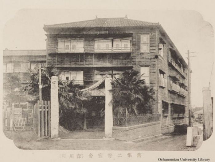 首先是学生和低级官员居住的“下宿屋”,即单身旅馆。第一高等学校、东京专门学校(早稻田大学的前身)、法政、明治、日本大学等学校聚集的本乡区、神田区以及邻近的牛込区、芝区内有很多下宿屋,聚居着众多的学生,其中还有本乡馆、龙涛馆那样的主要接待中国留学生的旅馆。这些下宿屋的房间通常分三帖、四帖半、六帖三种类型的单人房间,有的还有八帖的,厕所和澡堂公用。而且一般提供膳食,女佣们将饭菜放在小食案上,分别送到各个房间。如果有客人来访,还可叫客饭。除此之外,还为各个房间送开水,为学生们提供了必要的生活条件。