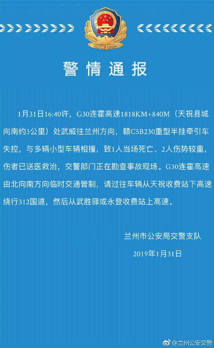 甘肃省兰州市公安局交通警察支队官方微博今日发布警情通报,1月31日16时40分许,G30连霍高速武威往兰州方向发生交通事故,有人员伤亡。目前事故正在处理中,该路段交通管制,过往车辆需绕行。