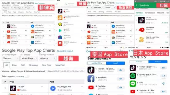 2018年,在日本地区评选的年度最佳应用榜单中,抖音海外版应用Tik Tok登顶第一。根据第三方市场数据机构App Annie的统计数据显示,抖音海外版已覆盖150多个国家和地区,先后在40多个国家的应用商店内排名前列,是全球增速最快的短视频APP。