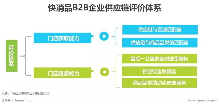 快消品B2B企业成功的关键在于提升供应链能力,供应链体系建设以门店获取与门店服务为两个抓手,由此构建了供应链的两个评价指标。门店获取能力方面,由于快消品具有强区域特性,所以快消B2B企业需建立适应区域特性的供应链网络;同时不同商品品类对供应链的要求不同,企业不断优化主营品类,动态调整与主营品类匹配的供应链体系,从而更好支撑获取门店的能力。门店服务能力方面,企业应具备完善的仓储物流体系能够才能实现最后一公里的及时送货服务;快消品应收账款高,资金周转需求大,因此具有金融资源优势的企业能够帮助门店解决融资问题,增强门店粘性;同时具有大数据优势的企业能够帮助门店实现商品品类的最优动态选取组合,这些是B2B企业供应链体系建立护城河的关键。
