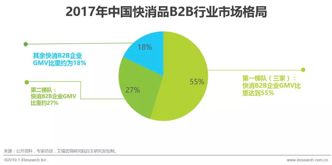 艾瑞咨询认为,快消B2B赛道上各方,尤其是优势地位电商,将进一步加快竞争扩张战略。2017年,第一梯队GMV在快消B2B行业的GMV比重达到55%,第二梯队比重约27%。