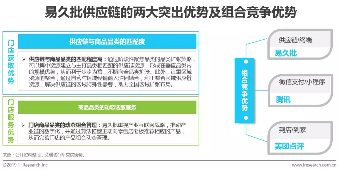 易久批于2014年9月成立,由酒水品类的批发切入,现已形成了“全区域、全品类”的平台战略的发展格局。发展历程分为四个阶段:2014年,由酒水品类的批发切入B2B;2015-2016年快速进行了全国化的区域扩张;2016-2017年推进对非酒品类的扩张;2017-2018年实现向产业链上下游的服务扩张-仓配共享、供应链金融、终端连锁。对供应链优势起着加持作用的是易久批独特的股东背景优势。美团点评和腾讯两巨头加入易久批阵营后,将形成“易久批(供应链/终端)+腾讯(微信支付/小程序)+美团点评(到店/到家)”的配称组合,对内达成多赢,对外形成组合竞争优势。这将推动易久批‘全国化、全品类’的平台战略,进一步强化易久批成为‘新零售基础设施’的地位。