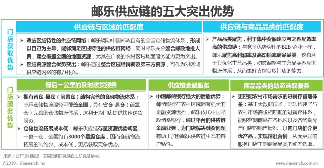 邮乐结合中国邮政的全国资源优势,打造线上线下独特的新零售供应链平台和渠道。邮乐在门店获取与门店服务方面具有独特优势。门店获取方面,邮乐建立了适应区域特性的供应链网络,且供应链与商品品类匹配度较高。门店服务方面,邮乐拥有完善的仓储物流体系能够实现最后一公里的及时送货服务;邮乐依托中国邮储银行在农村区域强大的金融资源优势,帮助门店解决融资问题,增强门店粘性;同时利用匹配农村市场需求的进销存管理体系,帮助门店实现商品品类的最优动态选取组合。