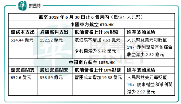 航油成本目前在航空公司成本构成中无疑是最大的一块成本开支,而国际油价水平的波动将对航油价格水平和公司燃油附加费收入带来影响。截至2018年6月30日止的六个月內,东航营业支出总额为人民币524.44亿元,其中飞机燃料一项为人民币152.52亿元,占总支出比重达到近三成。另外若不考虑燃油附加费等因素调整,平均航油价格上升5%,则公司的航油成本将上涨人民币7.63亿元,而净利润将减少5.72亿元。南航亦在其2018年中期报告中提出,燃油价格每上升10%,其期內的营运成本负担将增加人民币19.38亿元。