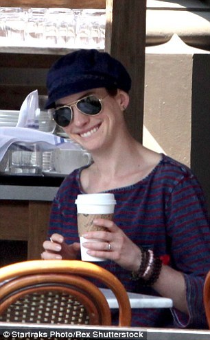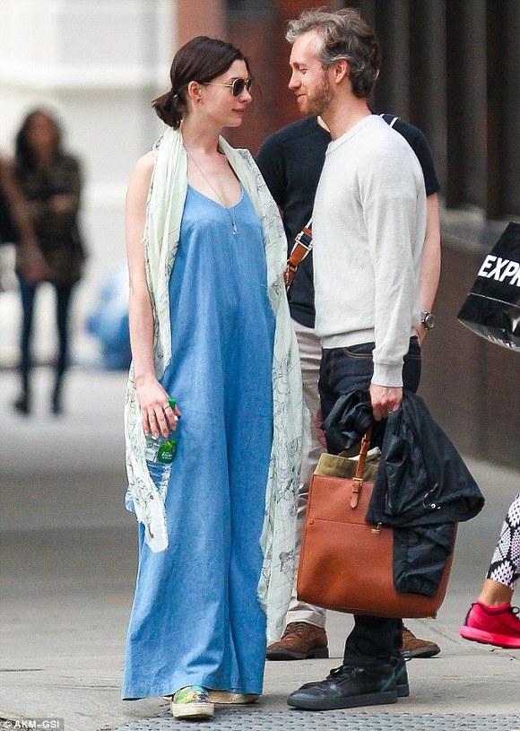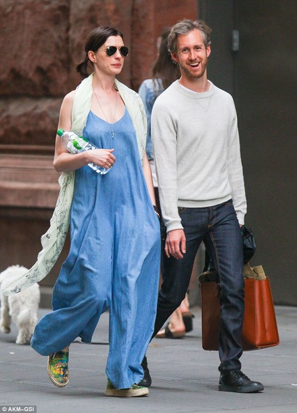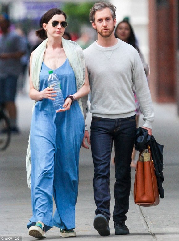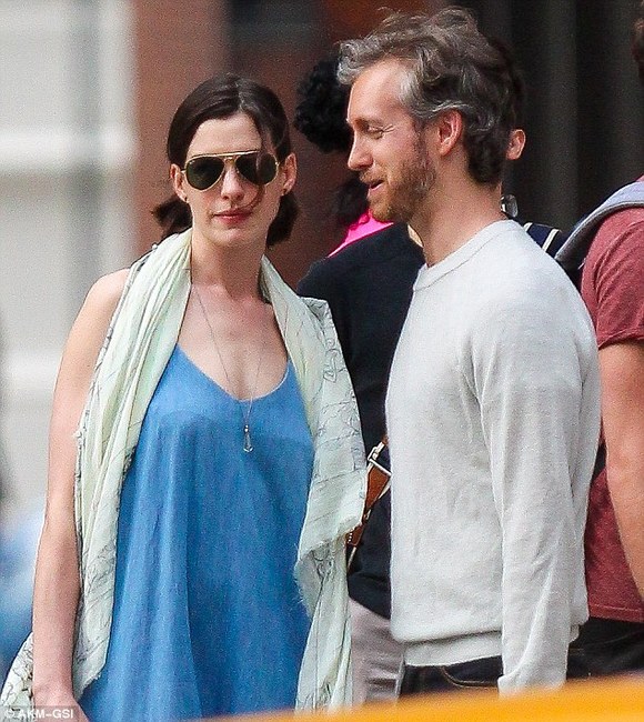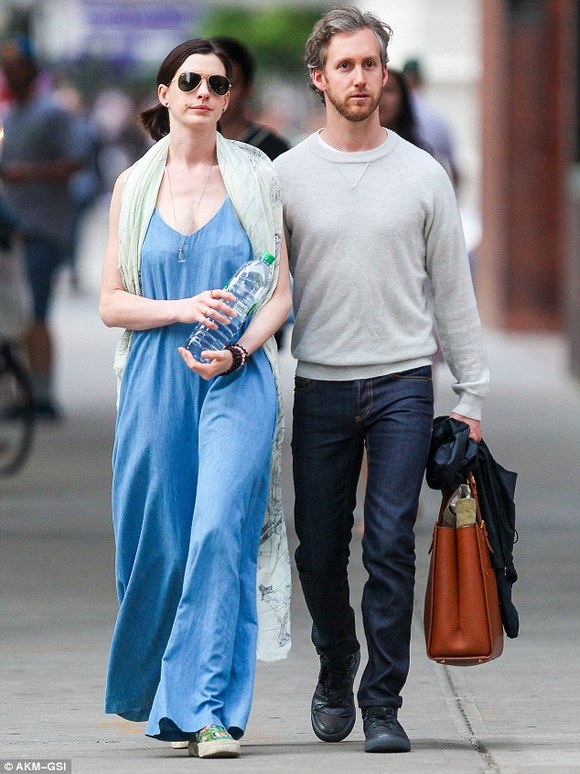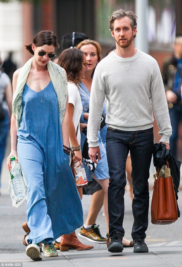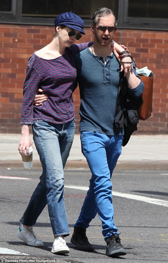 安妮·海瑟薇(Anne Hathaway)显然是位热恋中的女人。上周六,她和丈夫亚当·舒尔曼(Adam Shulman)在公开场所大秀恩爱。周末,夫妻二人于纽约外出散步,在他们购买咖啡的时候,这位32岁的女星看起来正迷恋着和她结婚两年的34岁配偶。这是这位奥斯卡奖得主当天的第二次公开露面,此时她身穿粗布连身衣。早些时候她被拍到和亚当以及一位男性友人共同享用早午餐。