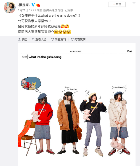 比如口红品牌往往呼吁女孩们即使素颜出门也要涂个口红,做精致的猪猪女孩;而零食餐饮则会说自己是猪猪女孩的最爱。搜索小红书和微博你会发现不少针对猪猪女孩的搭配,有不少是淘宝店铺的宣传——风格多是软萌可爱、人畜无害的。