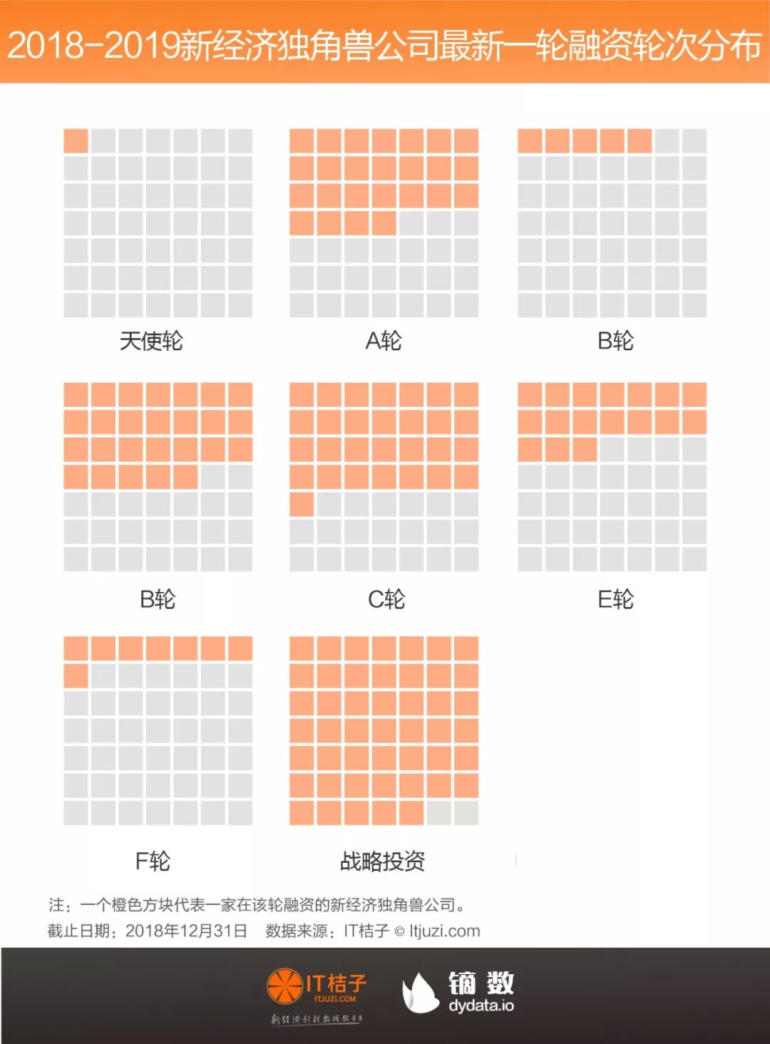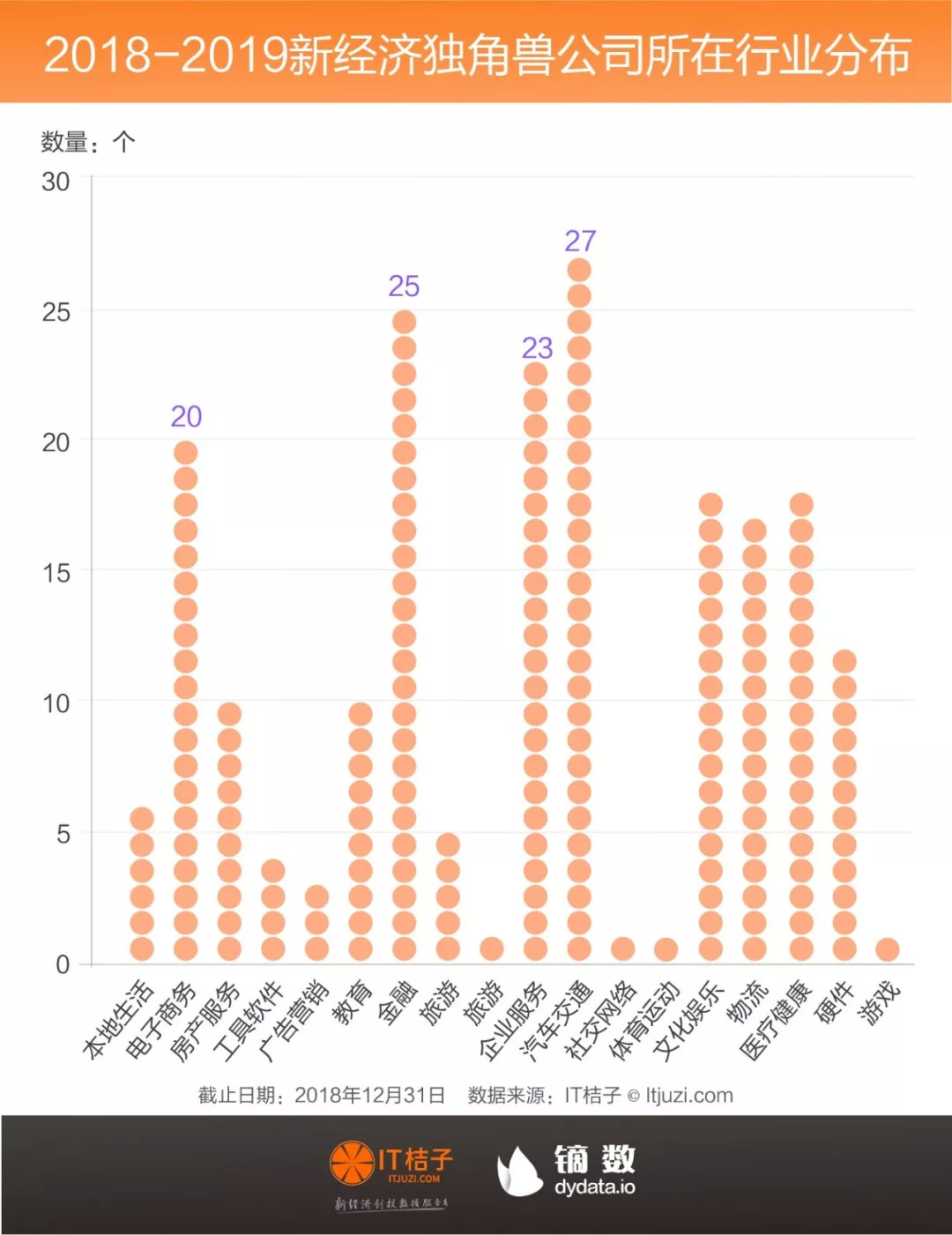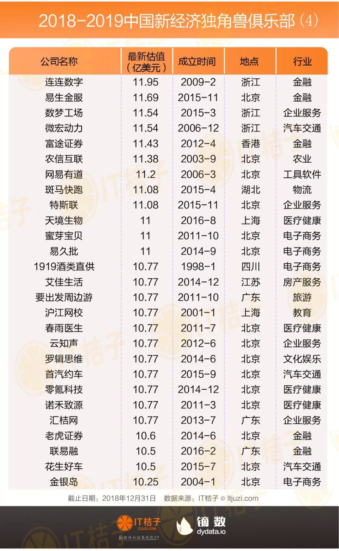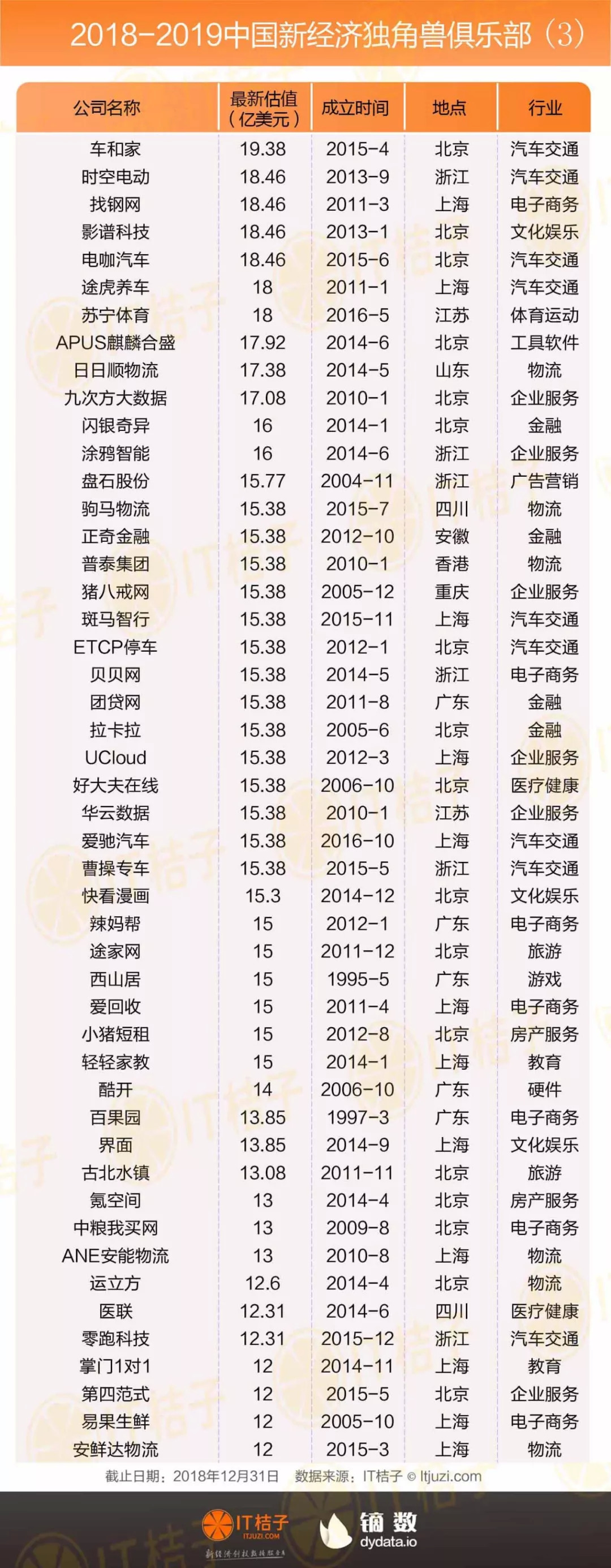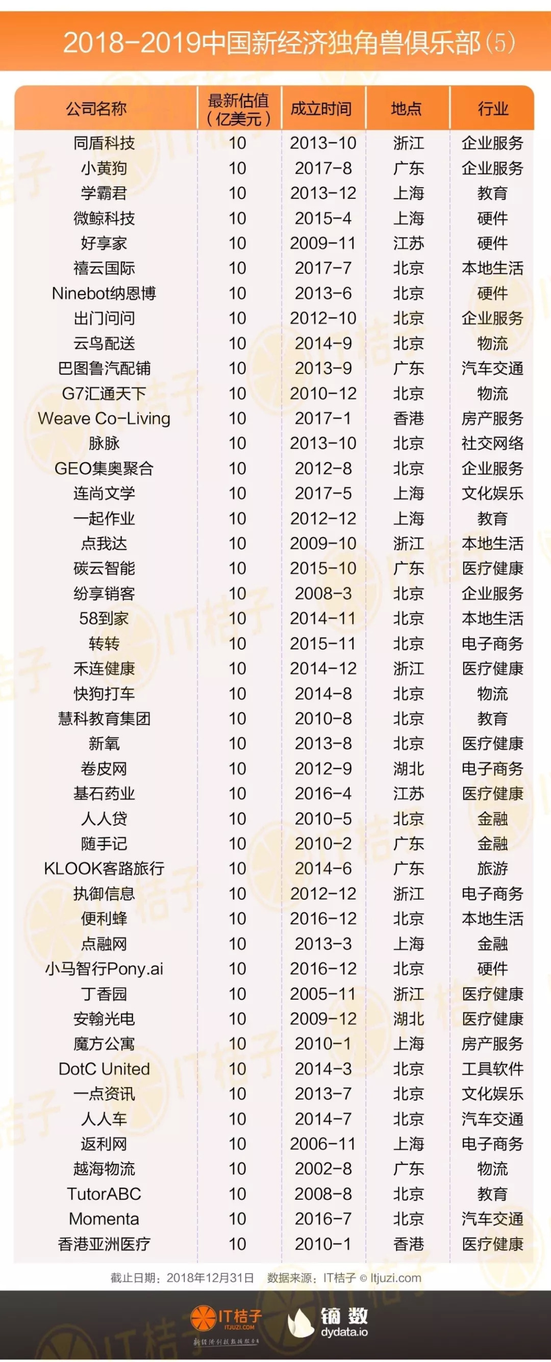 最后,在 IT 桔子的梳理中,刚达到独角兽门槛、处在 10-20 亿美金的公司共有 120 家,这部分公司数量占据独角兽俱乐部的 59%。这也说明独角兽俱乐部里超过一半的公司也是刚刚达到标准,仍未到「安全」的范围。在资本环境愈加冷酷的 2019 年,那些估值勉强达到 10 亿美金估值的公司如果业绩和现金流不够理想,随时可能滑落这个榜单。