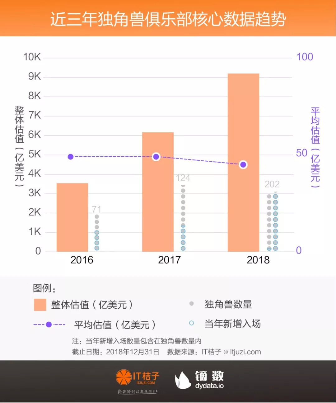 根据 IT 桔子统计,截止到 2018 年底,中国新经济领域独角兽俱乐部的入围公司达到了 202 家,相比 2017 年的 124 家,总数增幅达到 63%。