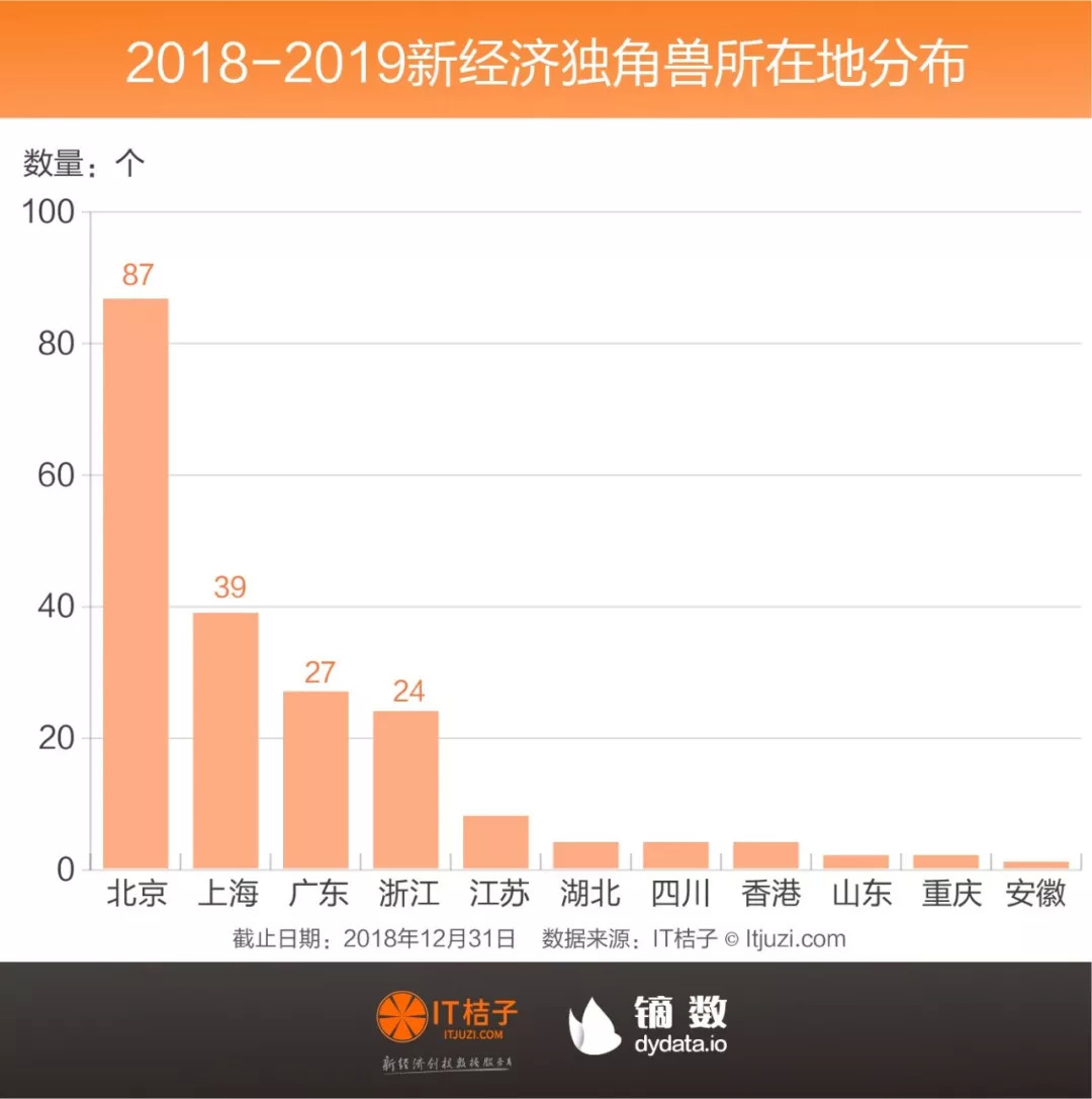 《2018-2019 中国新经济独角兽俱乐部》的 202 家公司从地域上看分布在 11 个省市,其中安徽、山东、重庆等地分别仅有 1、2 家,独角兽公司的分布仍十分集中。有 87 独角兽总部设置在北京、39 家在上海、27 家在广东——北上广集中了 75% 的独角兽,能与北上广各地稍微抗衡一些是以杭州为核心的浙江省。