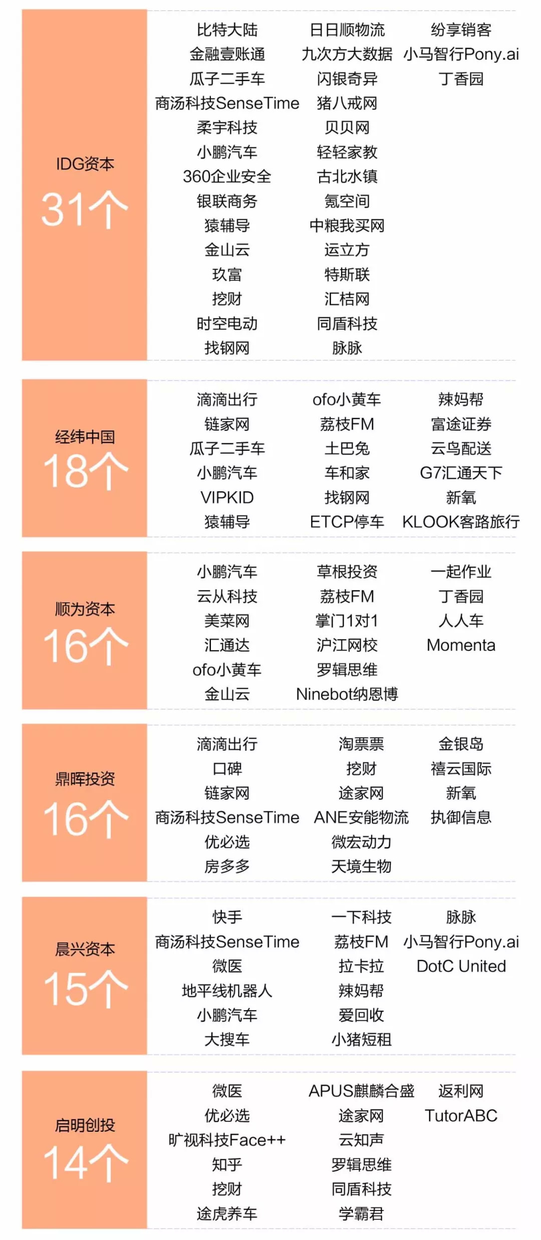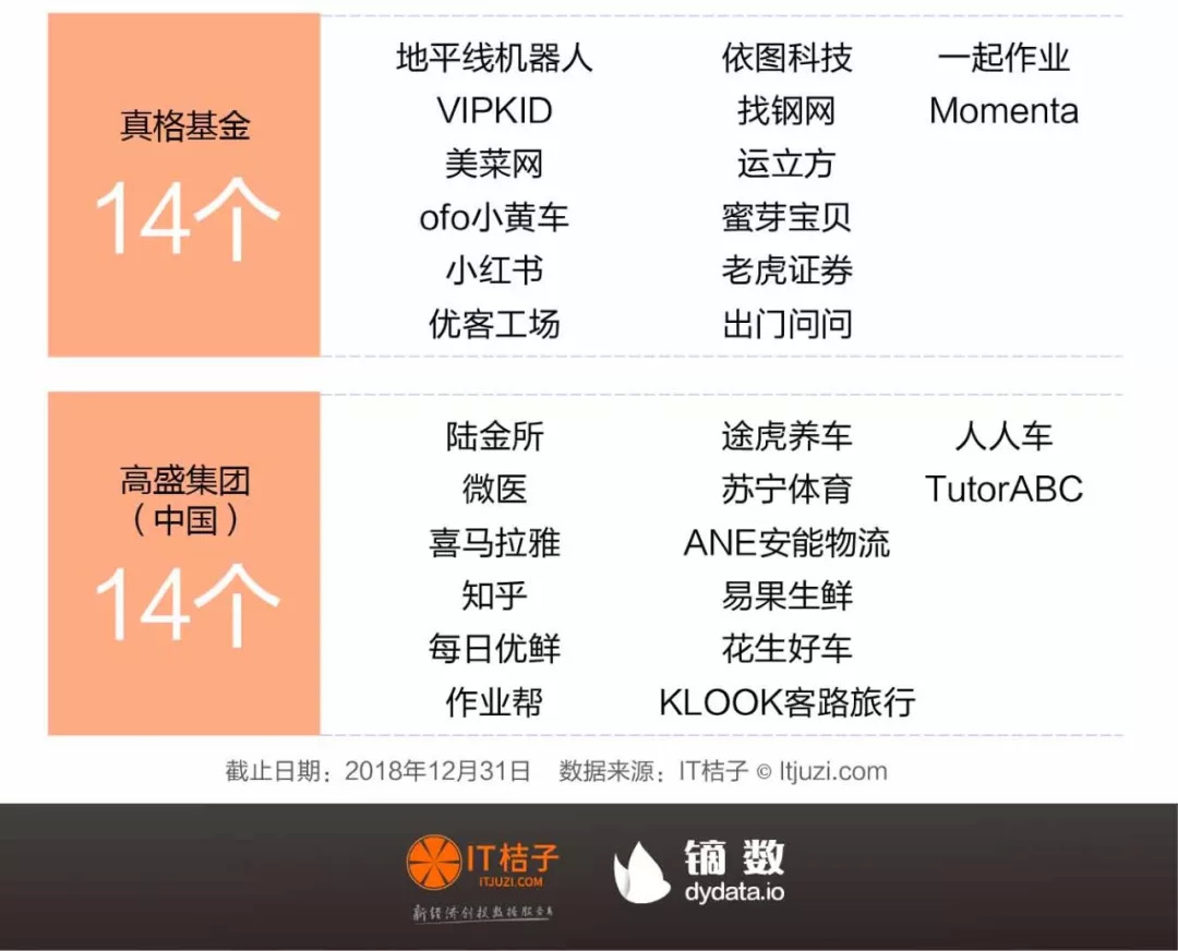 此外手握独角兽较多的 VC、PE 机构还有 IDG 资本、经纬中国、顺为资本、鼎晖投资、晨兴资本、启明创投、高盛集团(中国)等,另有天使基金真格也以 14 家独角兽而登陆榜单。