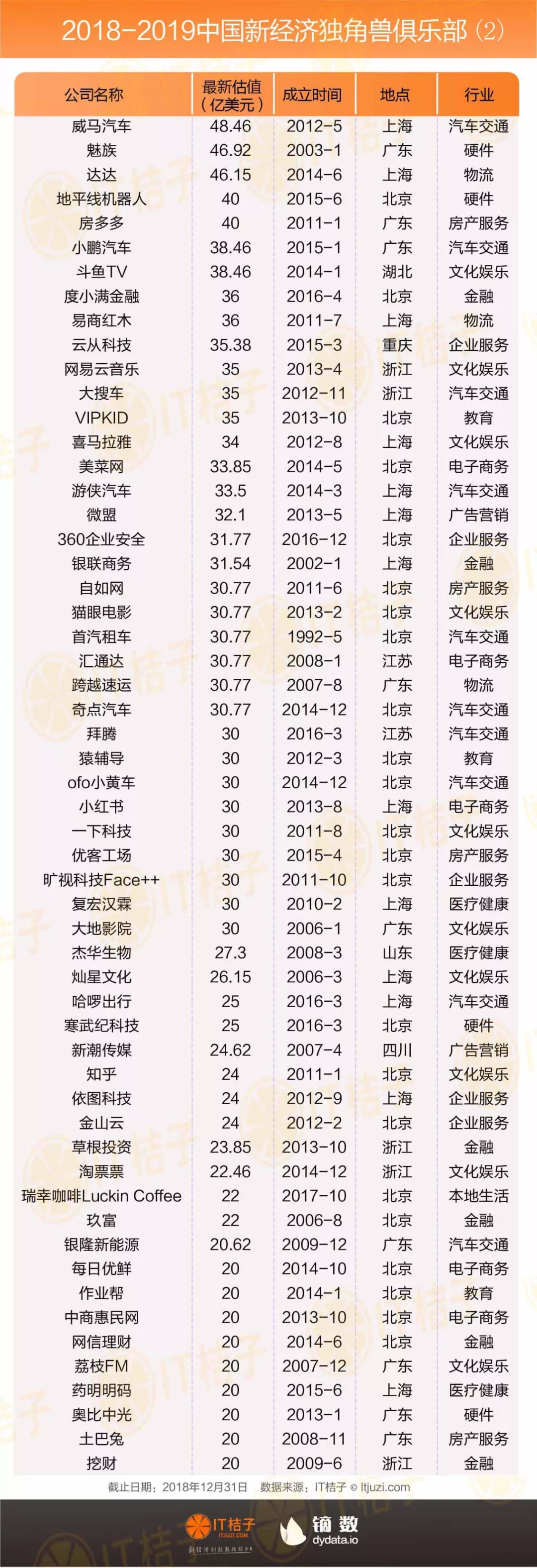 2018 年共有 25 家企业离开这个俱乐部,好消息是其中有 17 家是因为实现 IPO 而离开,有两家(摩拜单车、饿了么)因为被收购而离开,还有另外 6 家企业由于业务下滑或我们认为此前市场给的估值过高,在今年被挤掉水分而离开。