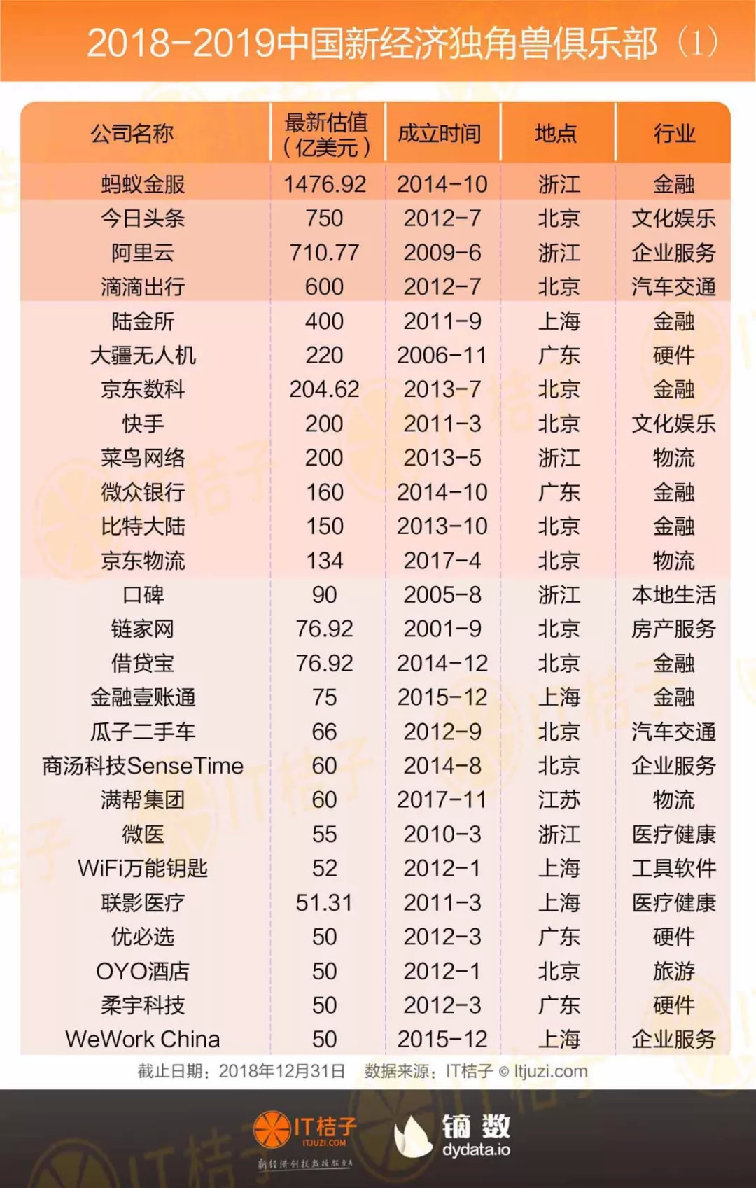 其他估值在 100-500 亿美金之间的独角兽公司还有陆金所、大疆无人机、京东数科、快手、菜鸟、微众银行、比特大陆、京东物流等 8 家企业。