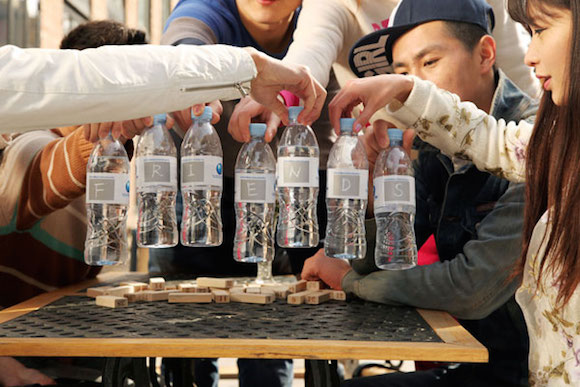 每次团体活动后都会剩下很多没喝完的矿泉水,原因是人们总是忘记哪一瓶是自己的。虽然人们试图用各种方法识别自己的瓶子,比如撕去瓶标、投入东西等,但却依然经常混淆造成水资源浪费。