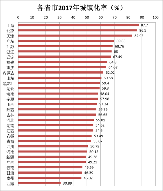 到2017年为止,全国城市化率不到50%的只有新疆、广西、云南、甘肃、贵州和西藏六个地区,上海、北京和天津甚至超过80%。
