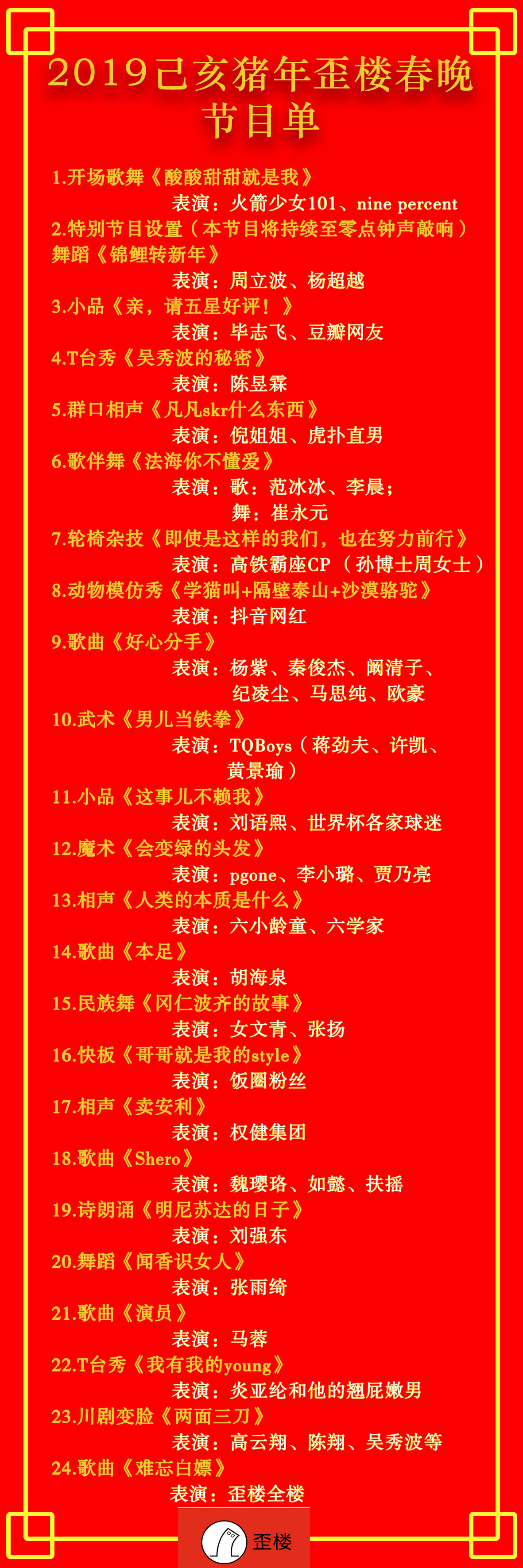 下面是本楼精心为大家设计的2019己亥猪年春晚节目单,请大家查收。