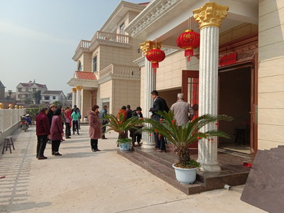 家里搬新家,大宴宾客,大门和门口铁树还有花坛里的树上都挂了小灯笼。还杀了一只300斤的猪猪,现在留下一只小母鸡养了起来。