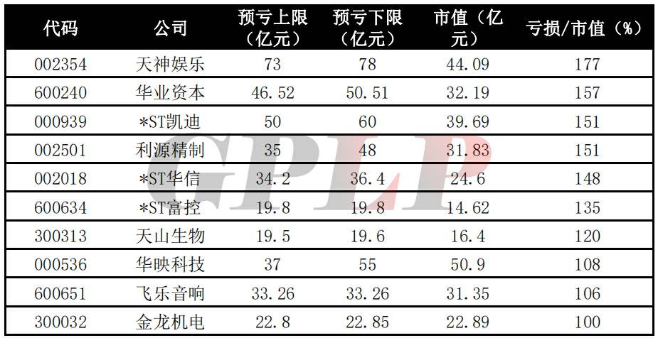 除了天神娱乐,*ST凯迪、华映科技、*ST华信等10家公司一年的净利润亏损已经超过市值。