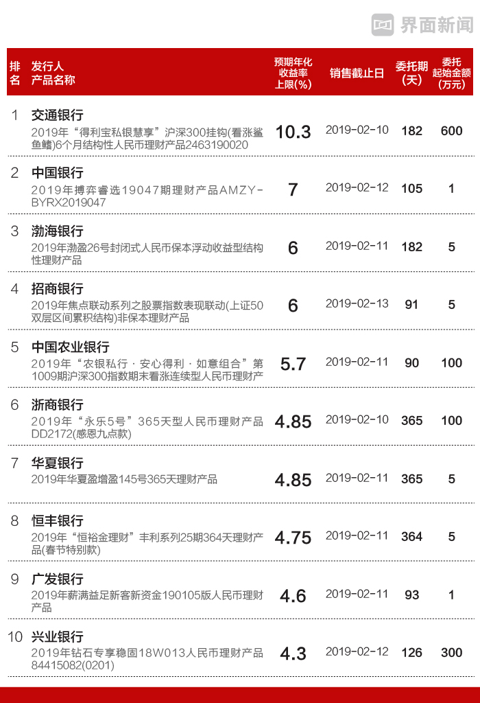 来看看本周有哪些可以挑选的银行理财产品。本周,18家国有商业银行和股份制商业银行全国范围在售针对个人的人民币理财产品185只,其中未包含结构性存款银行理财。界面新闻从每家筛选了收益率最高、最值得关注的理财产品,共10只。