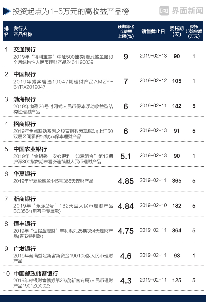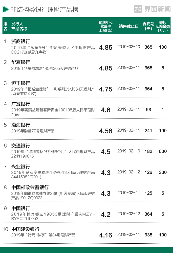 考虑到投资者的拟投资金额、风险偏好不同,本期还对起点为1至5万元的银行理财产品以及抛去结构化产品收益复杂设置、收益相对稳定的非结构类理财产品进行筛选,做成榜单,供投资者参考。