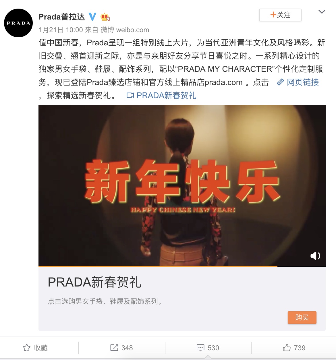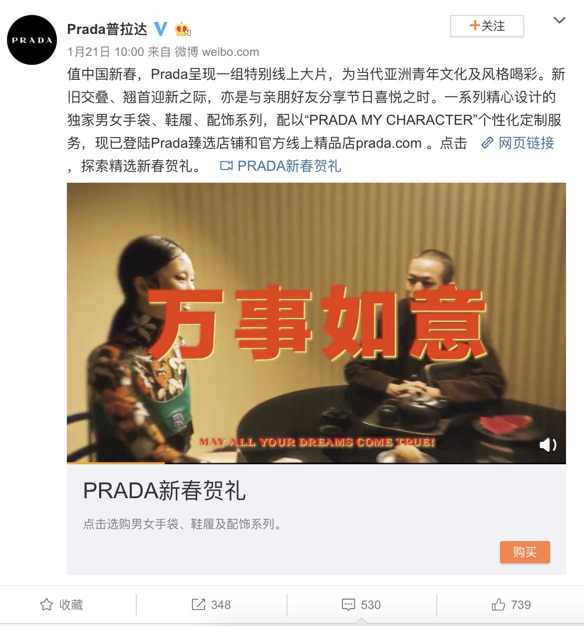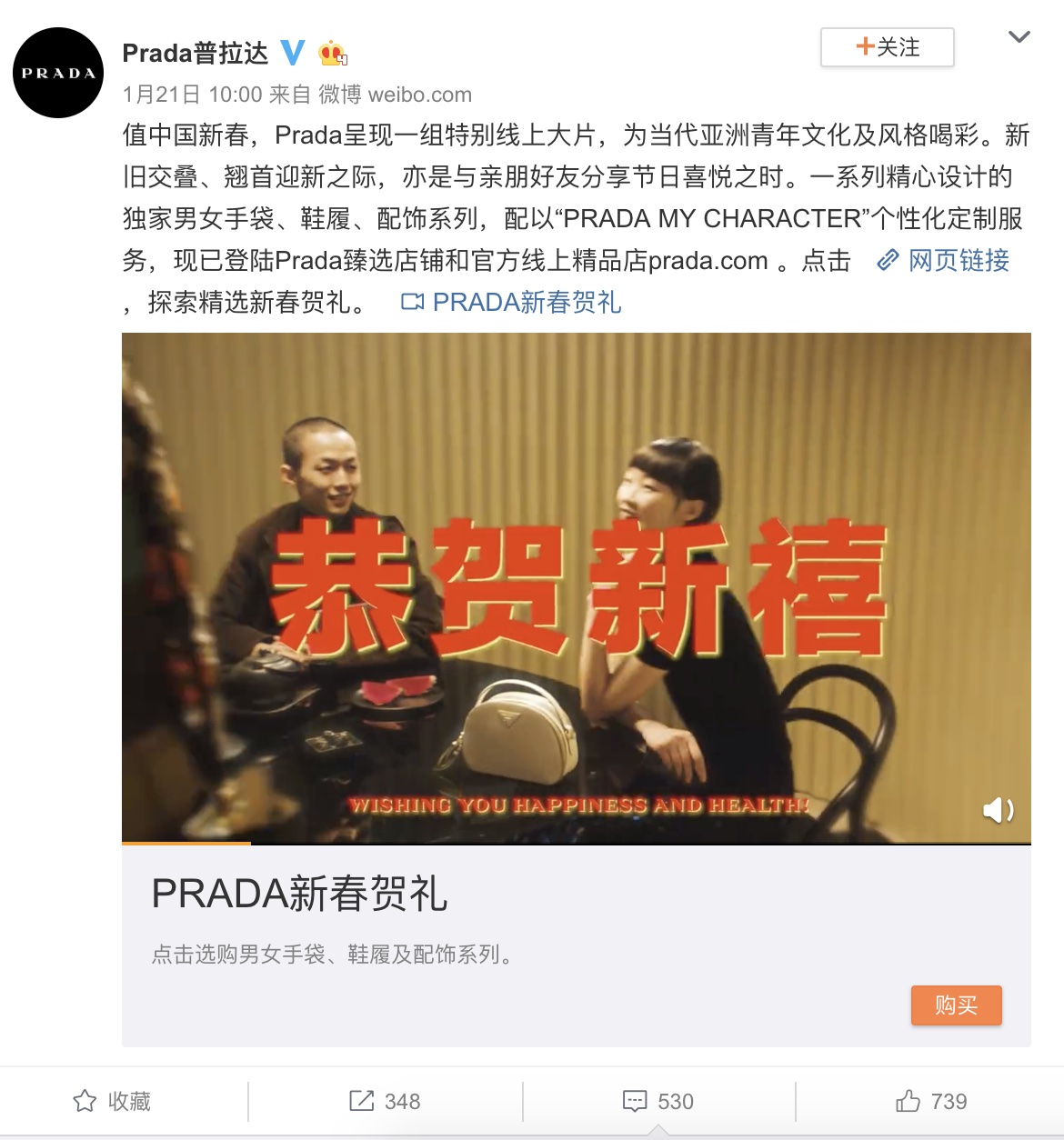 1月21日,Prada官方账号在新浪微博上线品牌为新春系列拍摄的广告,在庆祝新禧同时也为当代亚洲青年文化喝彩。