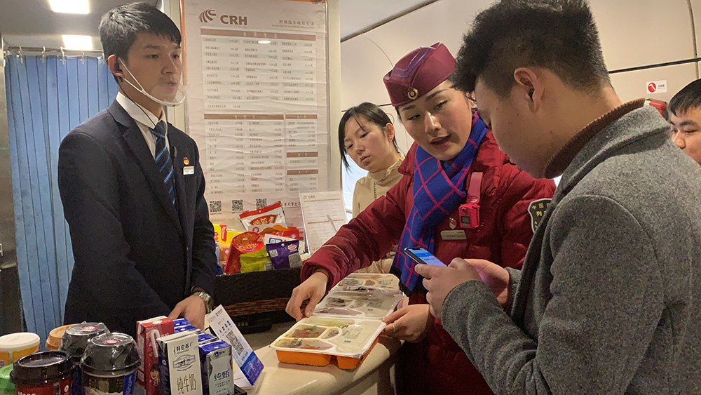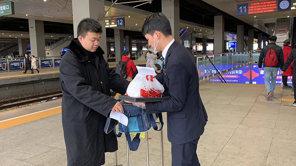 10点45分列车到达石家庄站时,乘务员到站台上取餐。这是乘客在12306 APP上提前点好的外卖,外卖送餐员会提前取好餐在站台上等待,待列车到达后移交给车上的乘务员,乘务员再将餐食送到乘客座位上。