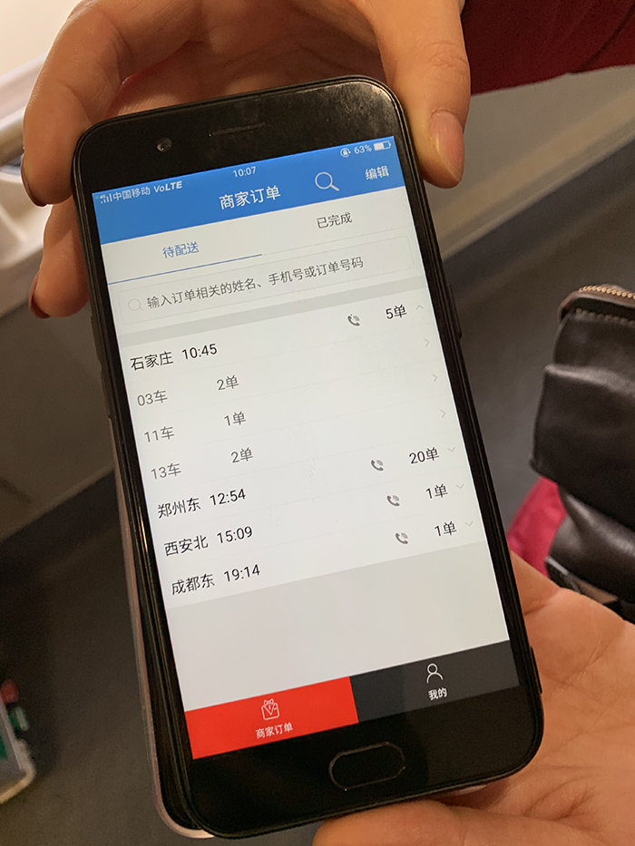 G571当天在石家庄站共有5单外卖,12点54到达的郑州东站由于接近饭点,共有20单外卖。