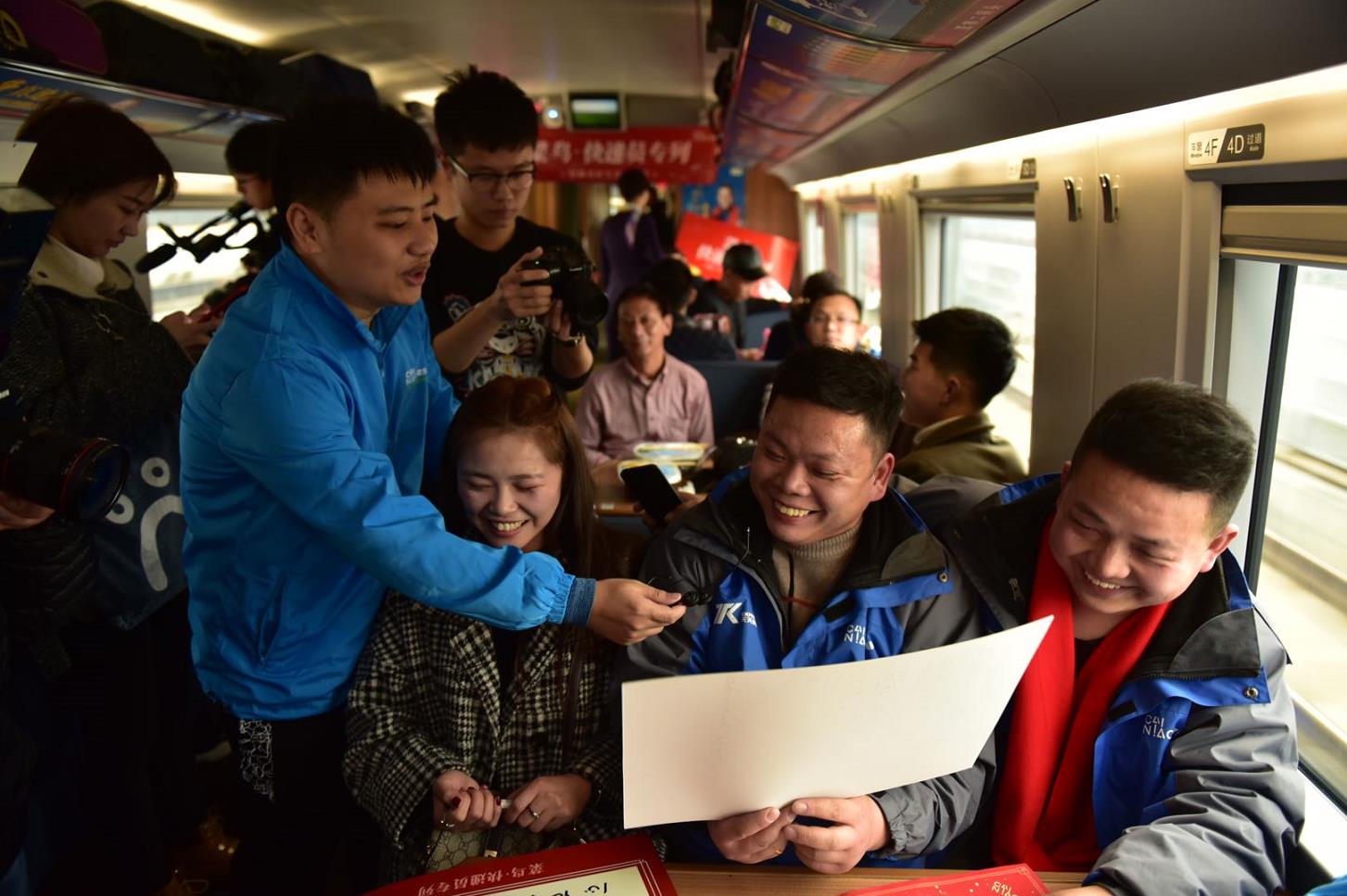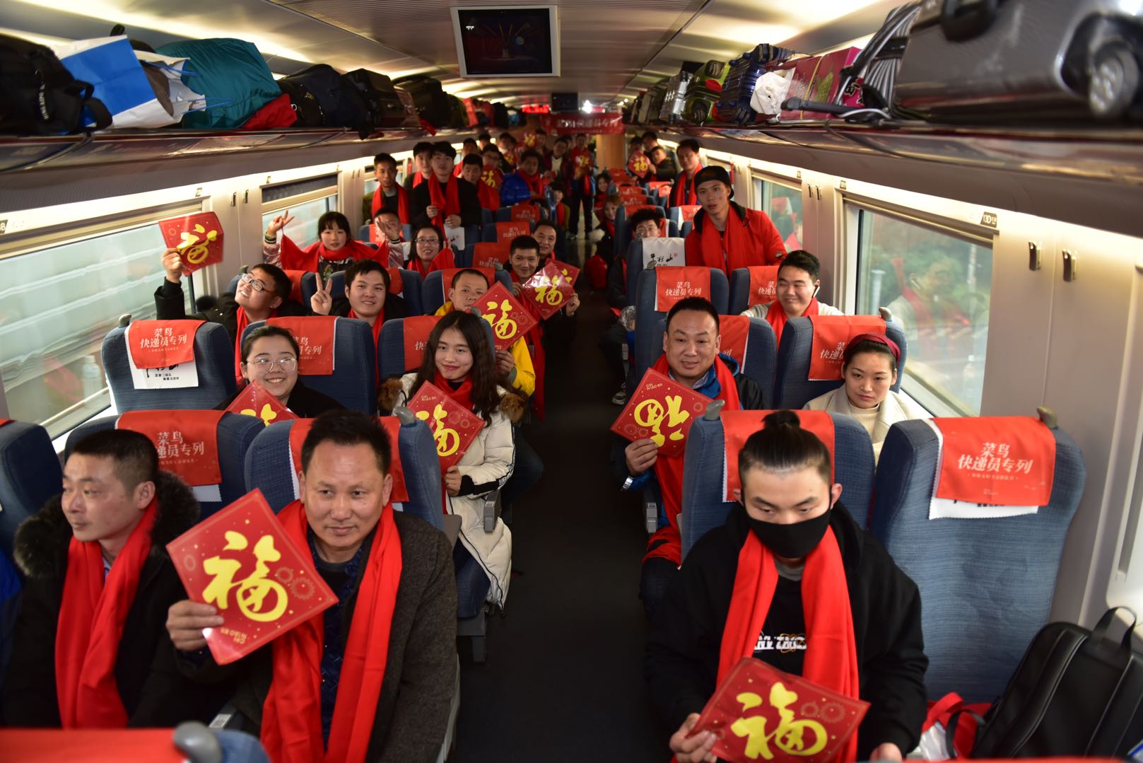 1月30日13时10分,G9402列车从上海虹桥站缓缓驶出,约400名在上海和周边地区工作的快递员和家人踏上了回乡之旅。这趟列车途径上海、苏州、南京、合肥、六安等站,于当天16时45分抵达终点金寨。这是菜鸟网络与铁路部门开设的一趟春运专列,全部由菜鸟购票,不同公司的快递员报名后免费乘坐。