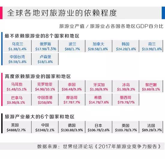 同时,世界经济论坛的《2017年旅游业竞争力报告》显示,全球对旅游业依赖度最高的五个国家:马耳他、克罗地亚、泰国、牙买加、冰岛,旅游业增加值在GDP占比中最大的也不过15.1%,最低的为8.2%。