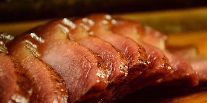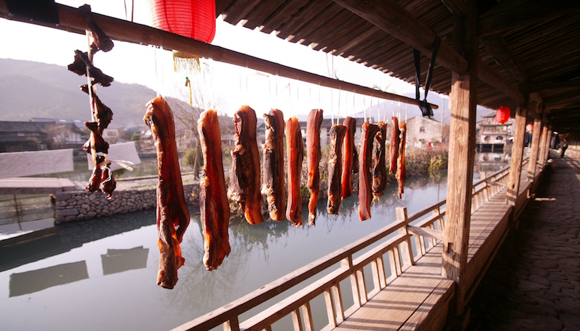 不管怎么吐槽它过咸的调味,嚼到腮帮疼的硬度,和挂一排时猛一看有些吓人,但出门游子最怀念,外地人最熟悉的,还是这一大块黑黢黢,散发着柴火香的猪五花肉。