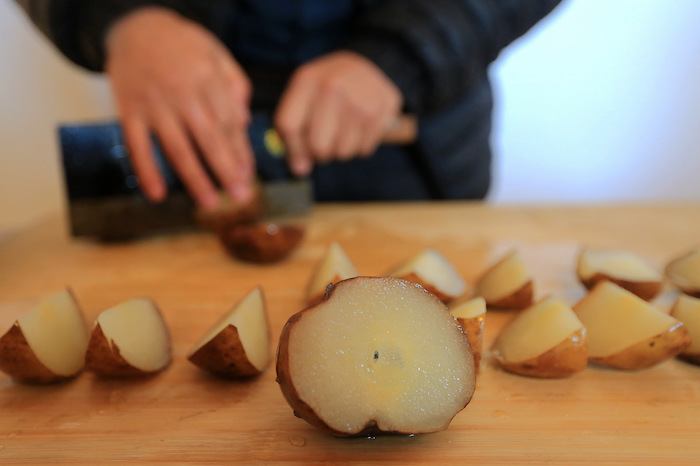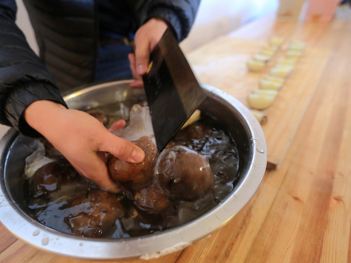 没几个东北人会对着硬邦邦的冻梨直接啃的,“半化”的状态才是最佳。吃冻梨前,我们都会先准备一个装着凉开水的小盆,把冻梨放进去“缓一缓”,待梨子外表结上一层冰壳,就差不多化到一半了。这时用筷子戳一个小洞,先吸凉凉的梨汁儿。再剥掉黑色的外皮,品尝带着冰沙的甜甜果肉。(是不是跟灌汤包吃法差不多!)