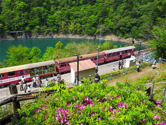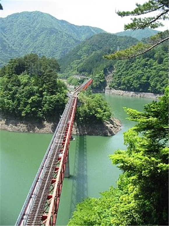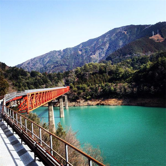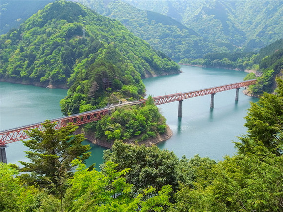 群山环绕的湖面上横跨着一座红色的铁桥,铁桥附近高高凸起的岬角上,一座小小的车站静静地等待着过往的行人,这就是山中的秘境——奥大井湖上站。铁路桥建在海拔490米的地方,高70米,列车通过时如同穿过仙境。