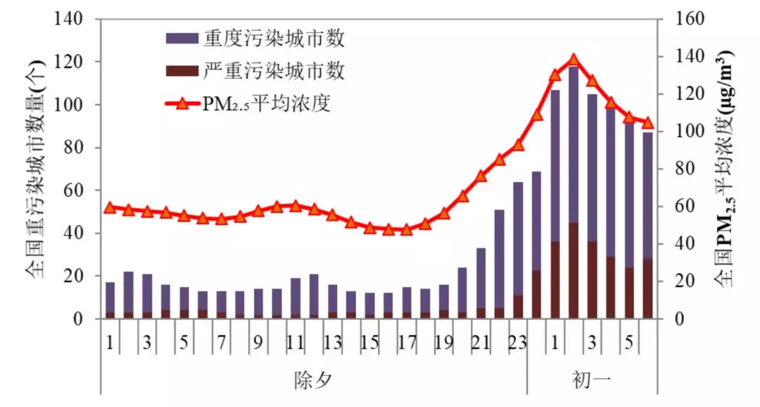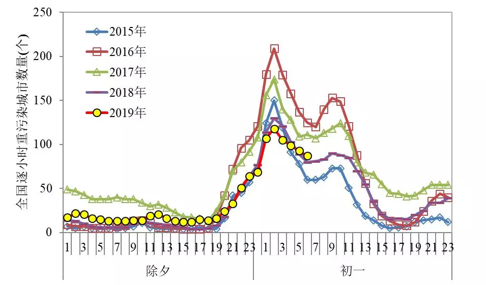 从近五年除夕至初一期间全国城市空气质量变化情况来看,2019年338个城市空气质量总体有所好转,PM2.5最大小时平均浓度较去年同期下降了14.2%,较前三年平均下降了31.9%。峰值污染期间全国重污染城市数量较去年春节减少了12个,较前三年平均减少了53个。