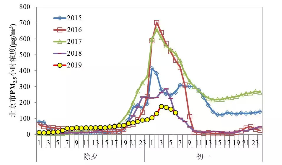 2019年春节期间北京市五环内禁放烟花爆竹,与往年同期相比,北京市污染程度明显改善,最大峰值浓度为177微克/立方米,较去年同期下降38.3%,较前三年平均峰值浓度下降67.8%。期间,北京市在5日3时至5时PM2.5小时浓度超过150微克/立方米,空气质量达重度污染,未出现严重污染,相比近三年春节期间,重度及以上污染时长已显著降低。