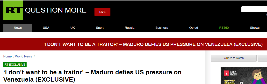 RT 5日报道称,马杜罗在接受RT西班牙语独家专访时说道:“我不在乎将如何被载入史册,我不想成为一个叛徒、一个懦弱的人,背弃自己对人民的历史性的承诺。”