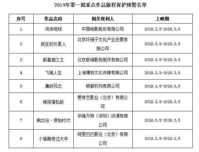 按照《国家版权局办公厅关于进一步加强互联网传播作品版权监管工作的意见》及国家版权局版权重点监管工作计划,根据相关权利人上报的作品授权情况,现公布2019年度第一批重点作品版权保护预警名单。