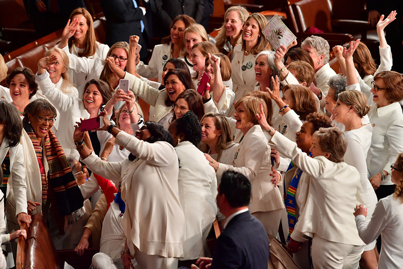 此外,在整个发表国情咨文的现场最突出的一个群体要数去年在中期选举中当选的一众女性国会议员。她们在当天统一穿上白色套装以纪念美国妇女获得投票权。在整个演讲的大部分时间,她们因和特朗普意见不同或是摇头,或是表情严肃。但当特朗普宣布国会女性议员达到创纪录的数量时,她们纷纷起立挥手为自己鼓掌,特朗普也以微笑回应。
