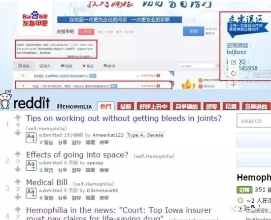 而这种自下而上”推举“消息和帖子的方式,从根本上杜绝了腾讯即将控股的Reddit像百度贴吧一样“酝酿”出魏则西这样的事件(上面为百度贴吧广告,下图为Reddit血友病群。