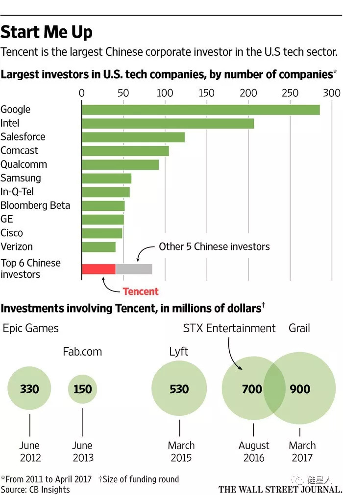 根据美国华尔街日报2017年的报道,如果算上美国本土公司,按投资美国科技公司的数量来说,腾讯可以排到第11名。