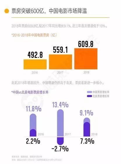 而2018年中国电影票虽然创历史地突破600亿,但票房增长情况却令人担忧,国家电影局发布的数据显示:2018年,中国电影保持多年来的增长态势,全年共生产故事影片902部,全国票房首破600亿元,达到609亿元,较上年同期增长9.06%。这是中国电影票房三年来首次增速低于10%。这亦宣告了中国电影票房的高速增长时代已经一去不复返。
