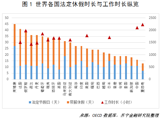 首先,法定假日少之又少,工作时间长之又长。从法定节假日、法定带薪年假数量看,刨除周末休假,国人每年的法定休假天数为16天,在全球主要国家中仅高于墨西哥(13天),不仅远低于荷兰(36天)、丹麦(36天)、瑞典(34天)等高福利国家,也明显低于法国(37天)、英国(33天)、美国(25天)等经济发达国家。即使与同以勤劳而享誉全球的东亚地区相比,中国法定假日数也明显低于日本(21天)、越南(22天)、中国香港(19天)、中国台湾(19天)、泰国(19天)和新加坡(18天)。从工作时长看,2018年中国人均工作时长达2100个小时,仅次于墨西哥的2225小时,远高于其他国家的工作时长(参见图1)。