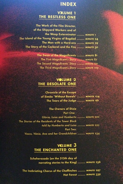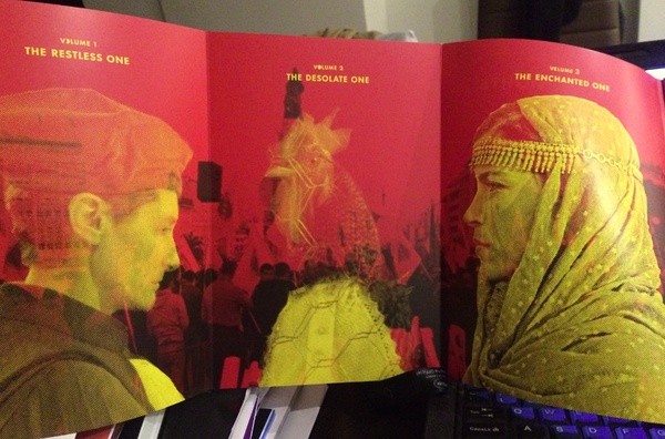 葡萄牙导演米古尔·戈麦斯的鸿篇巨制《一千零一夜》长达六个多小时共381分钟,被戛纳电影节主竞赛拒绝后去了导演双周单元,并一分为三放映,第一部分叫“不安之人”,第二部分叫“凄凉之人”,第三部分叫“迷醉之人”。这部片用了《天方夜谭》“故事中的故事”叙事结构,在第一部分一开始,戈麦斯正在拍摄一部关于一所造船厂关门造成大量人员失业的纪录片,与此同时他也对自己的创作感到困惑和手足无措,于是他开始讲故事。这个故事关于一座“处女岛”,岛上有个女人叫山鲁佐德每晚都会给国王讲故事。然后影片再进入第三层空间,将“处女的故事”影像化,三段故事分别叫“勃起的男人”“公鸡与火焰”与“高尚之泳”。每一个故事都有魔幻元素,例如鲸鱼肚子里的诊所,会说话的公鸡,使男人壮阳的魔法师,但每一个故事的风格有不尽相同,有政治讽刺,也有新闻纪实。