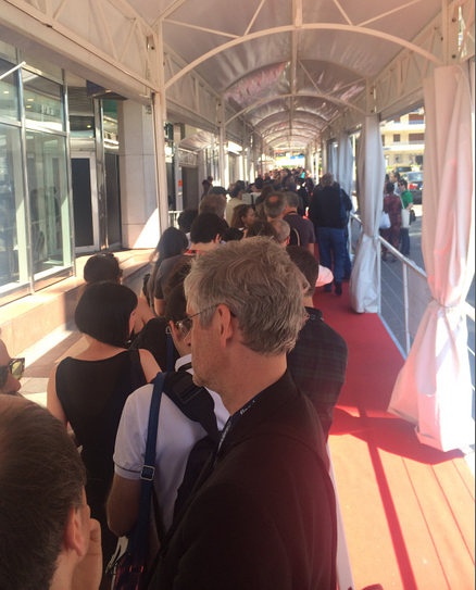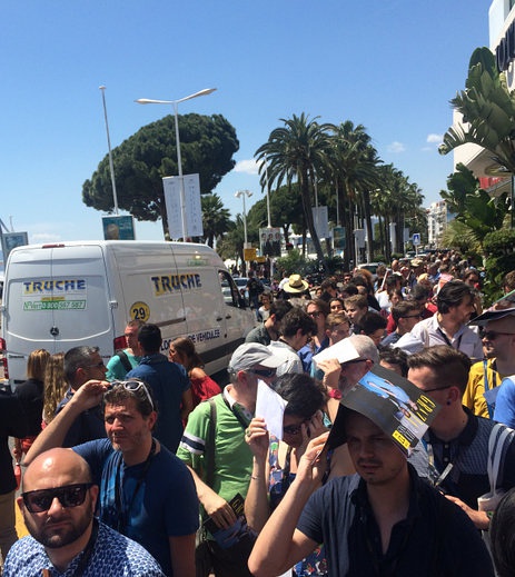 之后迅速赶去导演双周看《一千零一夜》的第一部分。导演双周的放映厅距离电影宫有10分钟的步行路程,但是因为电影节期间街上挤满了人,还有为了交通管制到处设立的铁栏杆,10分钟估计得走20分钟。导演双周单元只有两个队伍,一个是影迷证件队伍,不少法国学校都会组织学生来导演双周看片,另一个就是媒体/市场证件队伍,粉色加点和黄色证件全部混挤在一起,记者们脸上有多不爽可想而知。我们提前一个小时赶到,队伍已经绕过街口排成了长龙,排队时还看到马修·阿马立克“刷脸”入场。